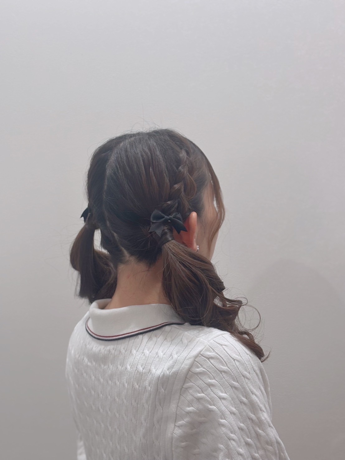 サイドのみつあみがポイントでかわいらしいヘアです。