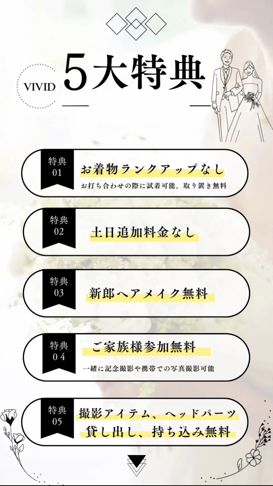 おふたりの大切な日をより良い思い出にするため豊富な撮影プランを展開しております。